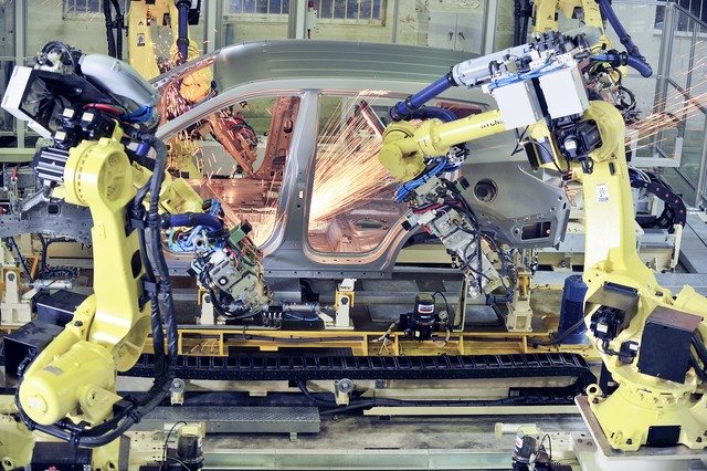 Robot hàn tự động đang hàn khung chiếc Hyundai SantaFe tại nhà máy của HTC tại Ninh Bình.