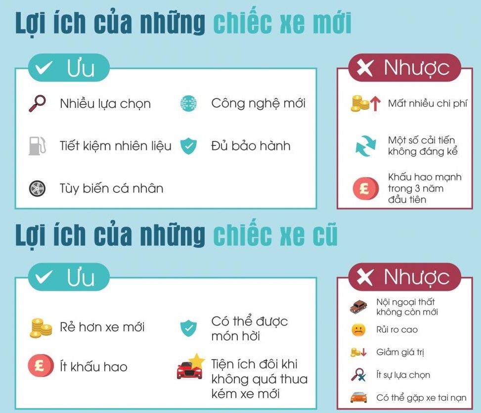 Với những gia đình đang có nhu cầu mua ô tô lần đầu, việc chọn mua xe mới hay mua ô tô đã qua sử dụng được xem xét rất kỹ trước khi quyết định. Dĩ nhiên, mỗi lựa chọn đều có ưu và nhược điểm riêng, tuy nhiên, lần đầu mua xe, bạn nên lập một bản kế hoạch cân nhắc lợi ích giữa việc mua xe mới và xe cũ cùng những điều cần chú ý khi đi thử xe hay xem xét hợp đồng mua bán.