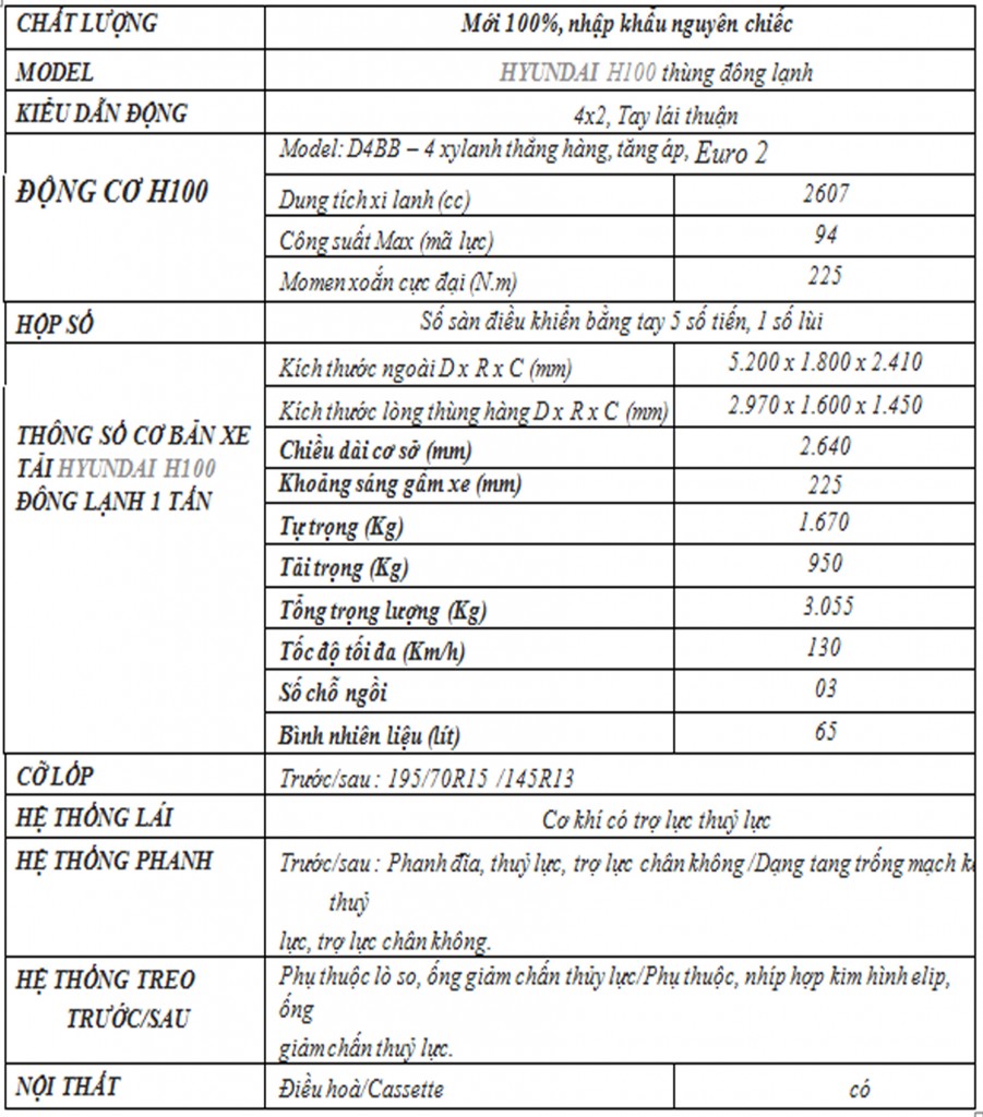 Thông số kỹ thuật xe Hyundai H100 đông lạnh :