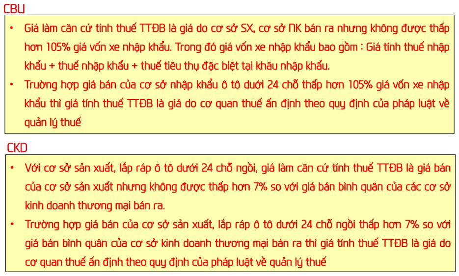 • Trường hợp giá bán của cơ sở sản xuất, lắp ráp ô tô dưới 24 chỗ ngồi thấp hơn 7% so với giá bán bình quân của cơ sở kinh doanh thương mại bán ra thì giá tính thuế TTĐB là giá bán của cơ sở nhập khẩu nhưng không được thấp hơn 105% giá vốn xe nhập khẩu.